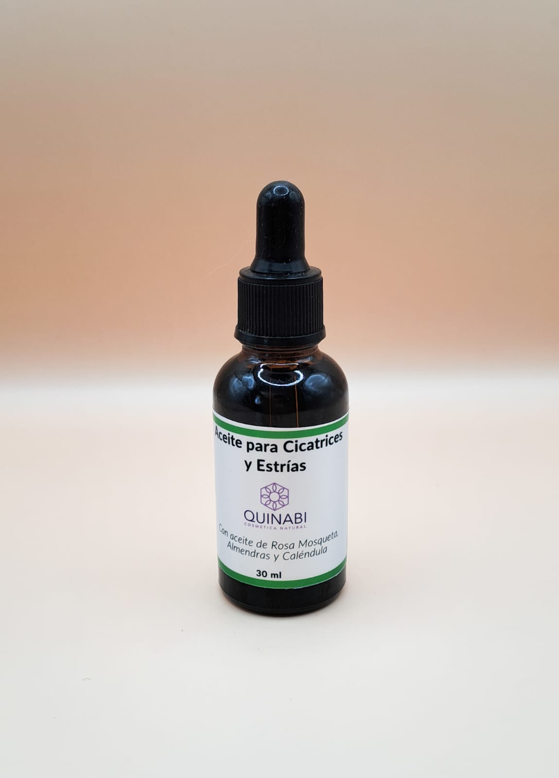 El Aceite para Cicatrices y Estrías Quinabi ha sido formulado desde la cosmetología natural avanzada, combinando extractos vegetales ricos en compuestos regeneradores y calmantes. Su sinergia de aceite de almendras, caléndula y rosa mosqueta nutre intensamente la piel, favorece la regeneración celular y mejora la apariencia de cicatrices, estrías o zonas resecas.
