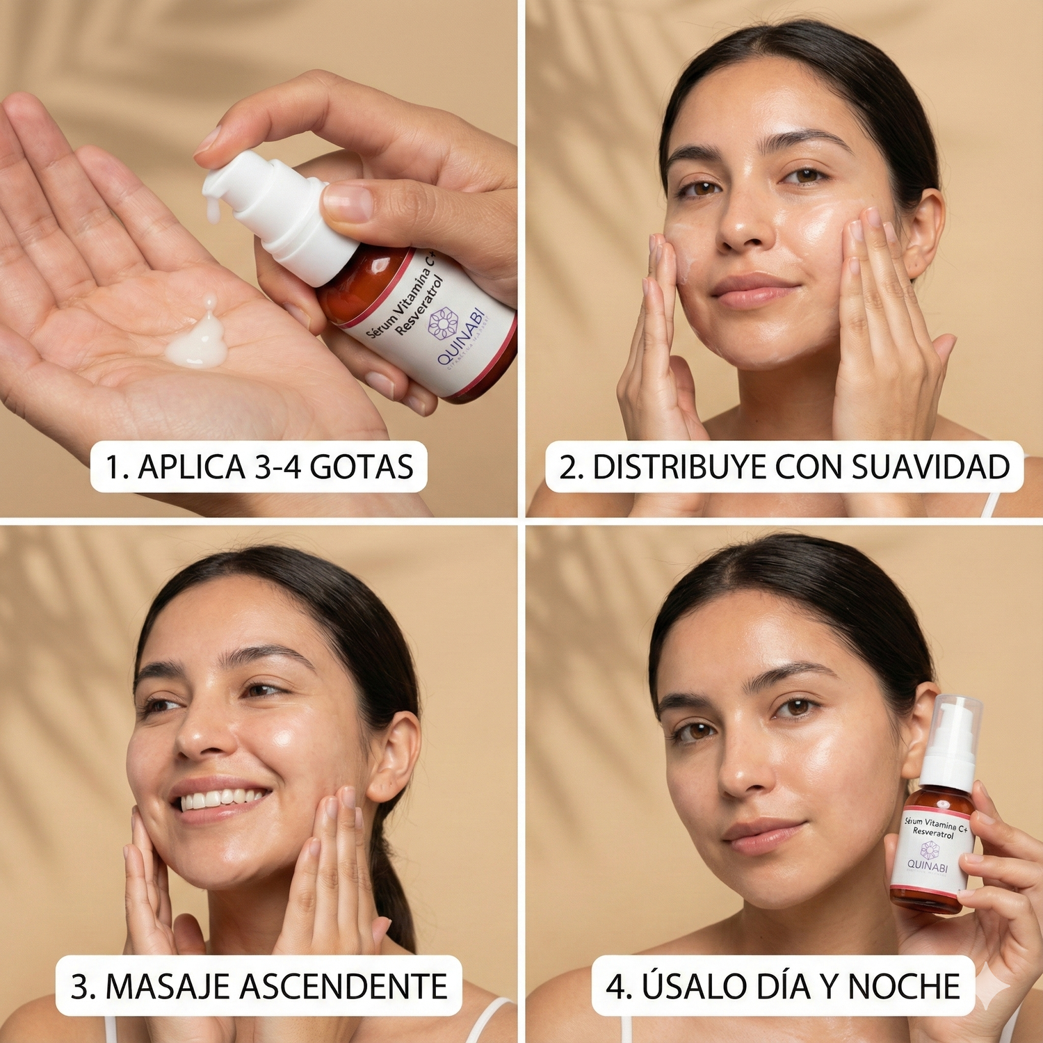 3. Activa: Distribuye con un masaje suave y ascendente por rostro, cuello y escote hasta que se absorba.